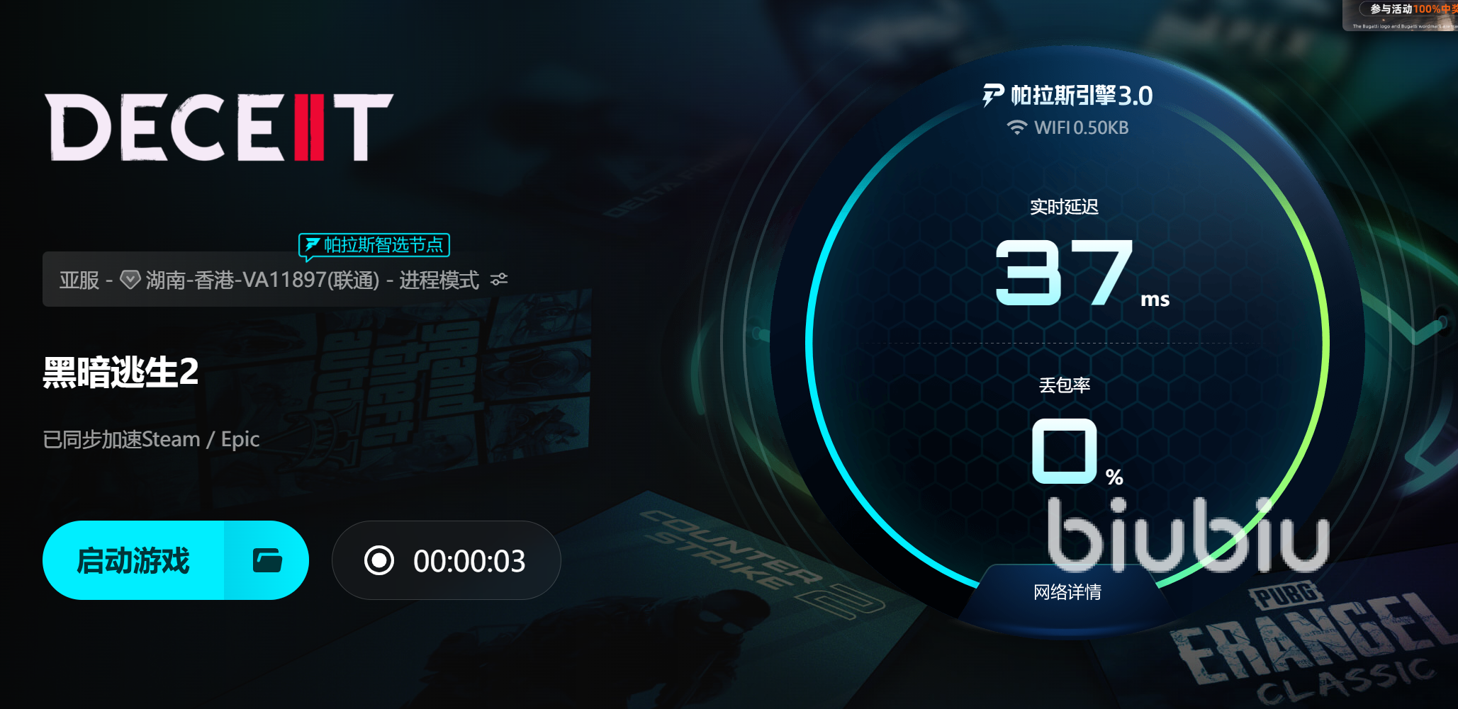 biubiu加速器不僅在性能上表現(xiàn)優(yōu)秀,還為新用戶提供了24小時的免費時長,讓玩家無需支付費用即可體驗優(yōu)質(zhì)的加速服務(wù)。通過輸入口令【biubiu不卡頓】,你還能獲得額外72小時的免費加速時長。biubiu加速器與冠軍選手Aixleft合作,采用帕拉斯引擎3.0技術(shù),能夠為玩家提供更為穩(wěn)定和高速的加速效果,特別適用于《黑暗逃生2》這類對網(wǎng)絡(luò)要求較高的游戲。