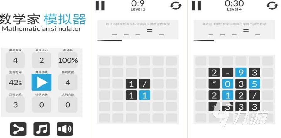 《數(shù)學(xué)家模擬器》是一款益智類的游戲,將各種數(shù)學(xué)運(yùn)算融合在一起,讓你邊玩邊學(xué)。整個(gè)游戲的畫(huà)面非常的簡(jiǎn)單,只有黑白兩色和藍(lán)色的基調(diào)。游戲中有很多關(guān)卡,每一關(guān)的難度都會(huì)增加,并且在通關(guān)的時(shí)候會(huì)有一個(gè)計(jì)時(shí)器。你將會(huì)根據(jù)屏幕上顯示的黑方塊數(shù),來(lái)計(jì)算正確的答案,然后把答案填進(jìn)藍(lán)方塊中。每過(guò)一關(guān),面板就會(huì)顯示你的闖關(guān)成功率和闖關(guān)時(shí)間,讓你有個(gè)大概的了解。