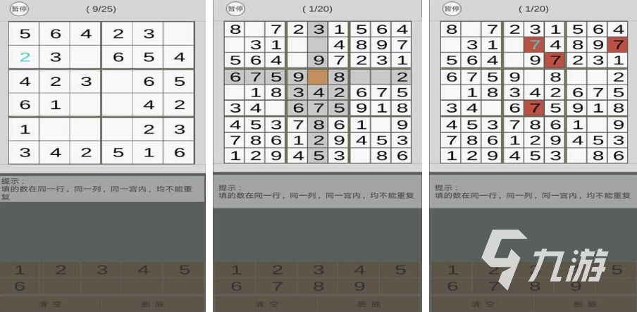 數(shù)獨(dú)九宮格是一種數(shù)字填充游戲。游戲會(huì)提供一個(gè)9X9的方格,在這個(gè)方格中,每行、每列以及每個(gè)3X3的小方格內(nèi)都會(huì)有一部分?jǐn)?shù)字已經(jīng)被填充好了。玩家必須把剩下的數(shù)字填滿這個(gè)框,這樣每一行,每一列,每一個(gè)小格子里的數(shù)字都只能顯示一次。獨(dú)九宮格的計(jì)算有難有易,復(fù)雜程度不一。一些簡(jiǎn)單的填充可以在幾秒鐘內(nèi)完成,而另一些需要用到比較高級(jí)的技巧才能解決。這種游戲有助于鍛煉您的數(shù)學(xué)邏輯思維、觀察力和決策能力。