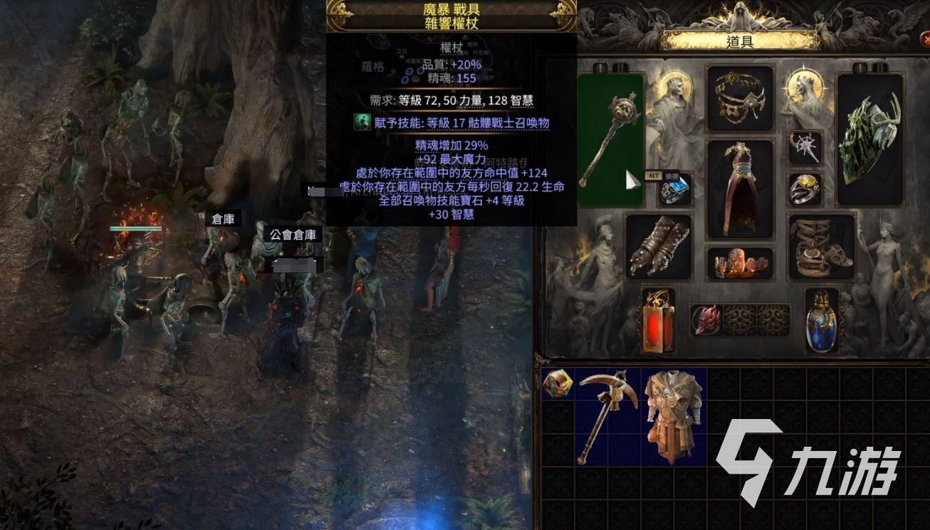1、武器:雜響魔杖。這把武器的技能可以使全部召喚物寶石加四等級(jí), 而且能夠帶骷髏騎士的召喚物,給敵方施加debuff。