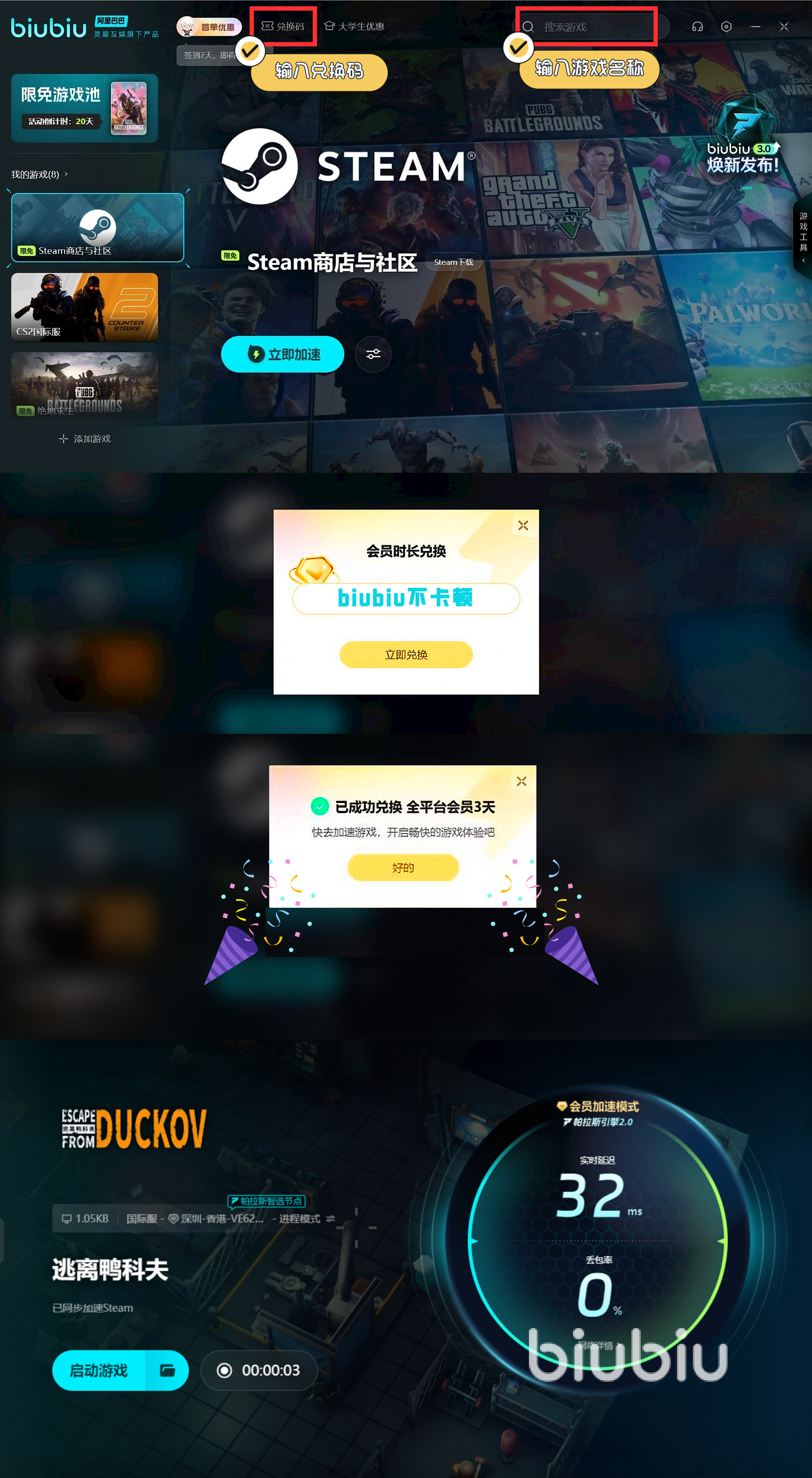 biubiu還有幾份大禮準(zhǔn)備好了等著玩家們?nèi)ヮI(lǐng)取呢,看看新手福利有什么,注冊(cè)之后原來(lái)新人可以馬上用到24小時(shí)加速服務(wù),如果知道【biubiu不卡頓】這個(gè)兌換碼,新老用戶再去換拿到的時(shí)達(dá)到了72小時(shí)的免費(fèi)服務(wù)時(shí)間,最終新人可以用的就是96小時(shí),超長(zhǎng)享受期。