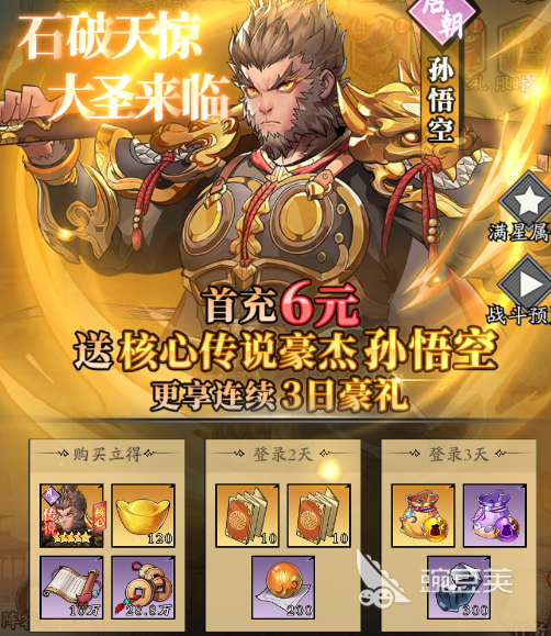 對(duì)于新服玩家而言,現(xiàn)在剛剛開服的簽到活動(dòng)一定不要錯(cuò)過,在登錄之后就可以拿到好東西。例如第2天登錄就可以獲取楊戩,第5天還有第6天還可以獲得資源獎(jiǎng)勵(lì)。新服還有一個(gè)專屬的楊戩降臨活動(dòng),在完成時(shí)還需要符合三個(gè)條件,分別是探索100關(guān),累計(jì)充值100元,還有次日登錄。在滿足之后就可以直接把楊戩抱回家,在有了這一個(gè)核心輸出之后,那一開始的養(yǎng)成還是比較省心的。想要更加的省心,那就直接通過第1次充值拿到孫悟空,這也是一開始沖6星的好選擇。