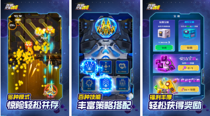 戰(zhàn)機(jī):代號666是個生存類型的飛機(jī)大戰(zhàn)游戲,想要在關(guān)卡中生存下去還是挺不容易的,因為你必須躲避所有子彈才可以,你的飛機(jī)被任何一發(fā)子彈擊中都會炸毀。游戲內(nèi)的百種技能系統(tǒng)等待你來搭配,你可以在技能系統(tǒng)中強(qiáng)化飛機(jī)的威力。游戲內(nèi)多種多樣的寶箱也期待你來開啟,開啟免費的寶箱也可以得到超精美的禮品哦。