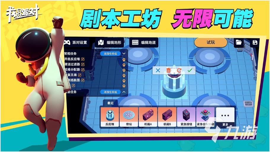 游戲內置關卡編輯器,目前提供賽博朋克、埃及法老、宇宙宇航、戰(zhàn)地風云等8套風格迥異的場景和物件素材。不同場景,滿足你不同的想像空間。還可以在場景中自定義游戲規(guī)則、劇情文案、觸發(fā),扮演不同角色,盡情釋放自己創(chuàng)造專屬劇本的玩法創(chuàng)意。超多的游戲元素融入其中,更有多樣的模式可供體驗,讓你感受到推理、合作、角色扮演等游戲內容的魅力,讓你與小伙伴們一起度過一段十分難忘的派對時光,更有不少充滿創(chuàng)意的小游戲。