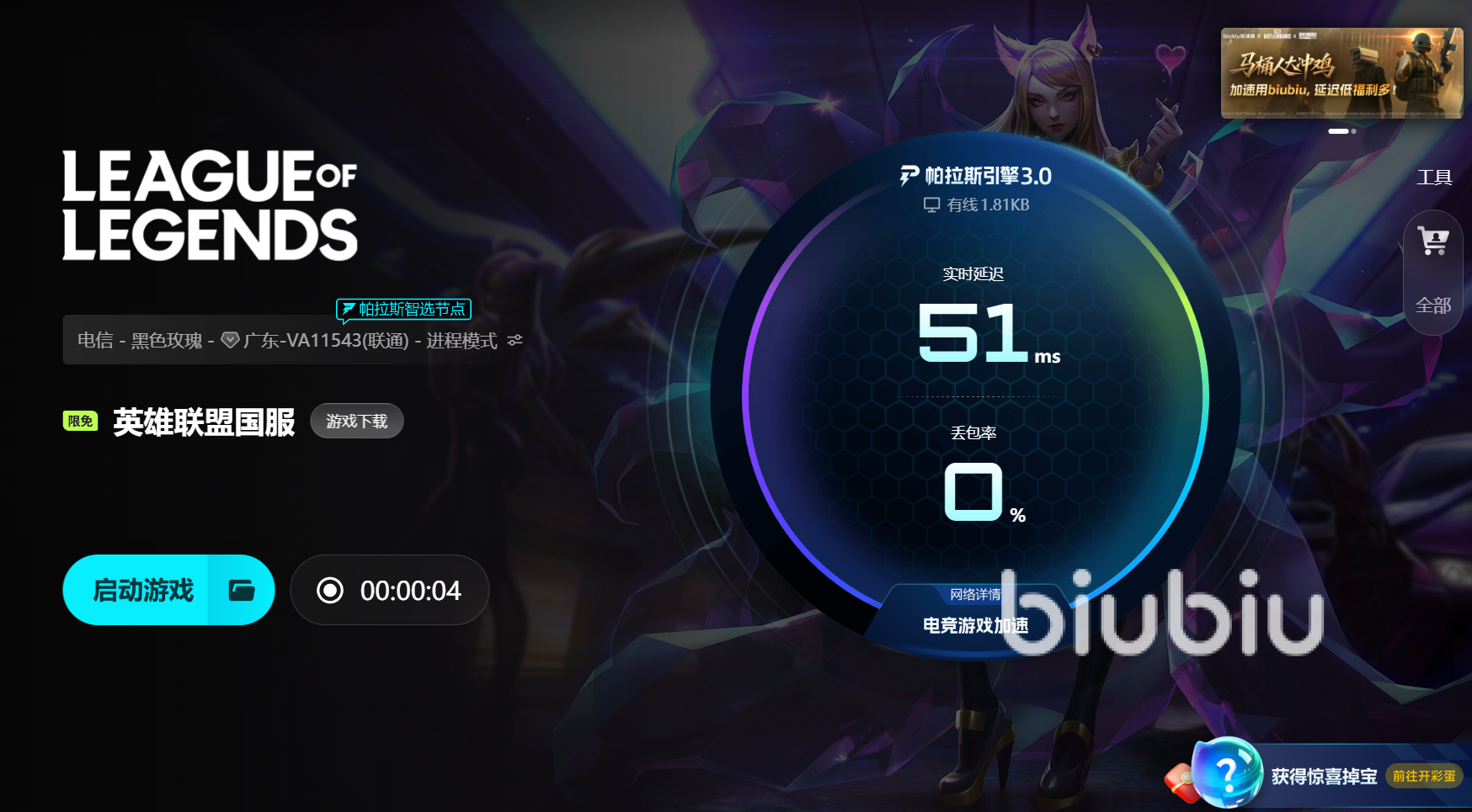 操作流程也不復(fù)雜。打開biubiu,搜索英雄聯(lián)盟,選擇LOL專屬加速節(jié)點(diǎn)后開啟,加速器會自動檢測當(dāng)前網(wǎng)絡(luò)狀態(tài)并給到延遲更低的線路,不需要自己去調(diào)端口、換DNS?;氐娇蛻舳酥匦逻M(jìn)游戲,讀圖會更順,皮膚、頭像、戰(zhàn)利品這些小資源能更快拉完,先進(jìn)訓(xùn)練營走兩圈、放兩套技能,就能感覺掉幀點(diǎn)被壓下去。