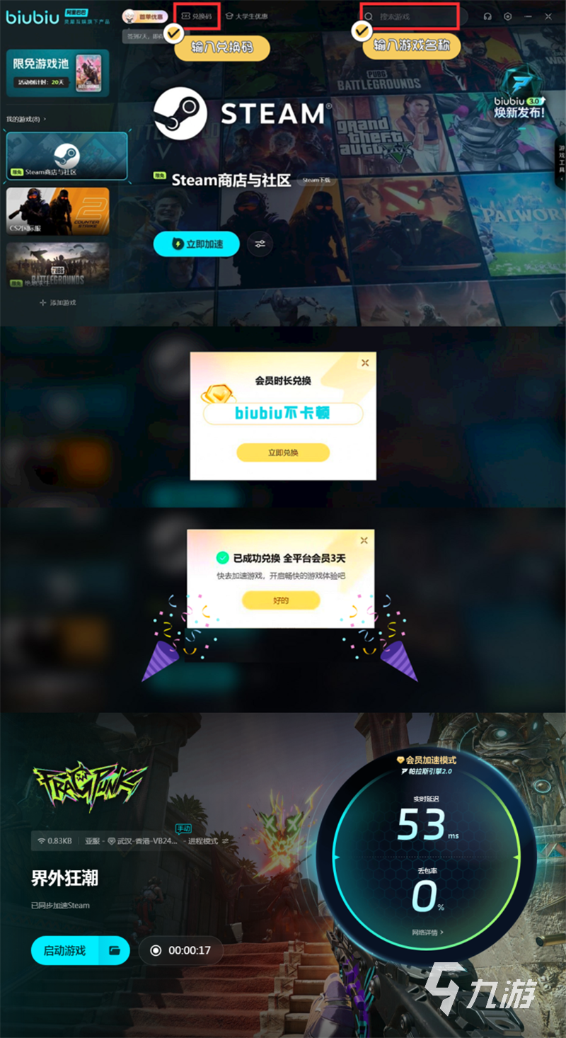 為了能夠玩好這款游戲,除了熟悉人物技能以及操作特點之外,還需要有一個良好的網(wǎng)速環(huán)境,biubiu就可以幫助達成這樣的目的。目前biubiu的新注冊賬號福利為贈送三小時會員時間。除了對于新手的福利之外,還有一項通用的兌換碼,每個號都能使用,那就是【biubiu不卡頓】,這個兌換碼能直接兌換72小時時間非常劃算。第1個人物是博洛克,它擅長技能傷害,能進行視野控制和陷阱布置,使用肩扛式的發(fā)射器發(fā)射高爆火箭彈,當(dāng)彈頭命中目標(biāo)時,對范圍內(nèi)敵人都能造成高額爆炸傷害,并產(chǎn)生擊退效果。