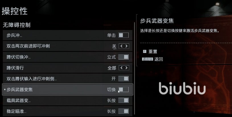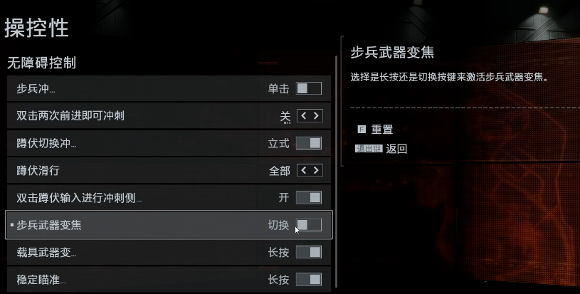 通過設(shè)置里的輔助功能,大家可以進(jìn)行操縱性修改,將步兵武器變焦切換,實(shí)戰(zhàn)時(shí)鼠標(biāo)右鍵長按瞄準(zhǔn)會改成單點(diǎn)。同時(shí)戰(zhàn)地六的瞄準(zhǔn)鏡還有一個(gè)功能,可以自動切換成熱成像,更方便大家關(guān)注敵人動向。