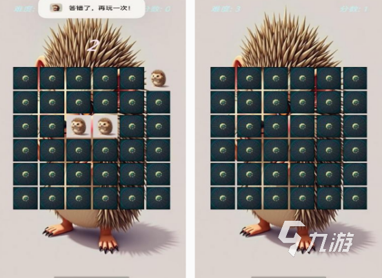 這款以可愛的小刺猬所設(shè)置的休閑記憶游戲,它有著簡單的玩法,還有可愛的小刺猬這種動(dòng)物,但是卻需要每個(gè)玩家在玩的過程中記住,刺猬所在的位置,通過正確將其翻出來的情況下,就能將刺猬抓住,獲得相應(yīng)的分?jǐn)?shù)。但如果玩家在記憶的時(shí)候,并沒有準(zhǔn)確的將小刺猬所在的位置記住,點(diǎn)擊錯(cuò)誤的話,就需要重新開啟。