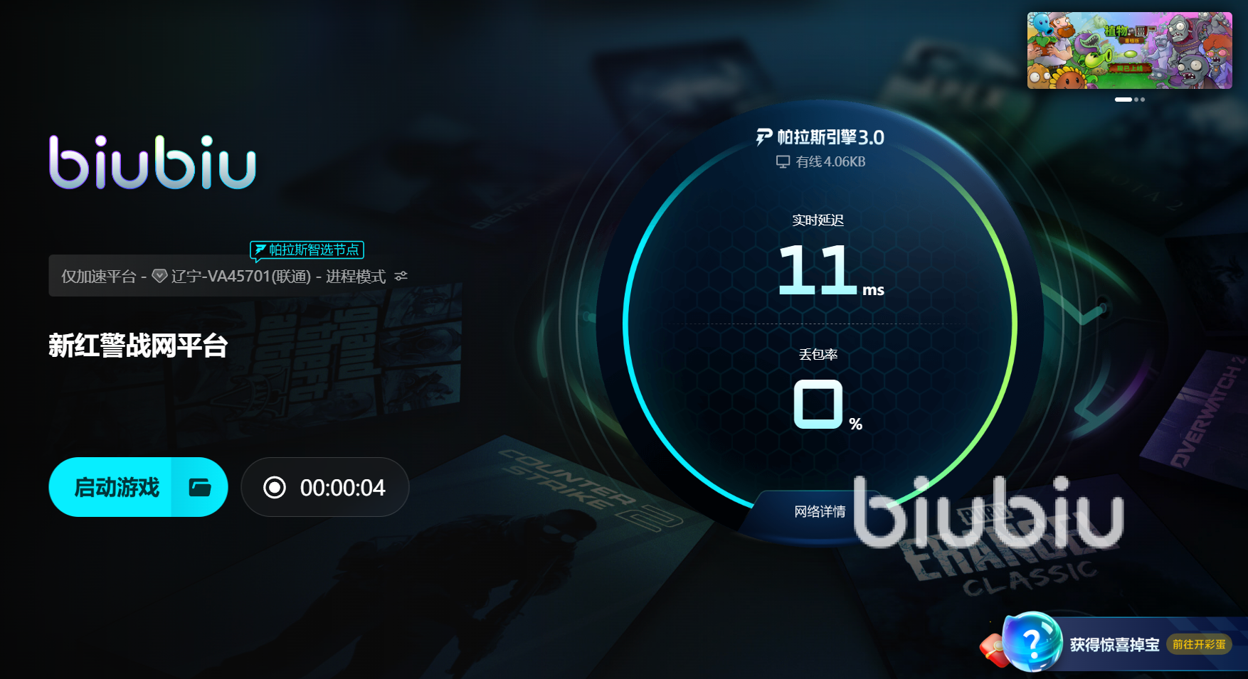 支撐這一效果的是biubiu的帕拉斯引擎三點(diǎn)零。啟動(dòng)紅警的瞬間,引擎會(huì)自動(dòng)探測(cè)當(dāng)下鏈路狀況,為數(shù)據(jù)拉出一條直連通路,減少繞行帶來的延遲與回退。一旦節(jié)點(diǎn)出現(xiàn)抖動(dòng),毫秒級(jí)完成備用路徑切換,連接不斷、傳輸不掉。這使這類老牌即時(shí)戰(zhàn)略在啟動(dòng)與加載階段同樣保持穩(wěn)態(tài),黑屏與加載失敗的觸發(fā)窗口被顯著收窄。