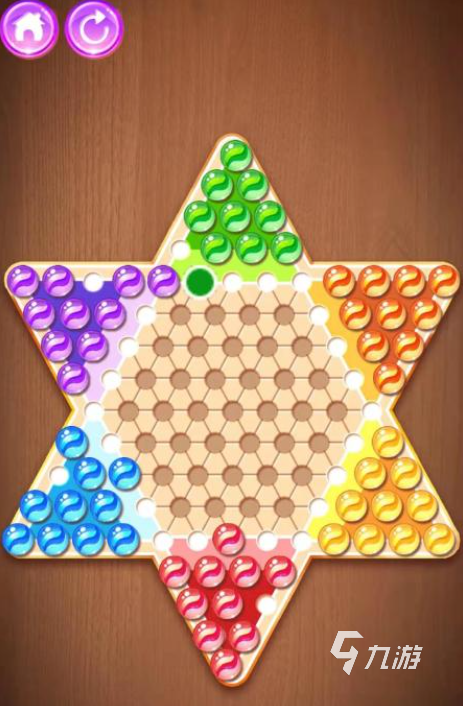這個游戲需要玩家把自己的棋子走到對面相對應(yīng)顏色的棋盤中,比如紅色棋子就需要把所有棋子走到正對面的紅色棋盤中。棋子只可以在周圍的格子中挪動一步,如果旁邊有棋子就可以把這個棋子當(dāng)做跳板直線跳過,如果間隔一格就有一顆棋子,就能連續(xù)跳過好幾步,最先把所有棋子走到對面的就算勝利。游戲中,玩家之間的棋子會經(jīng)常相遇,是互相合作牽線搭橋,還是堵住對方的去路使絆子,就看玩家自己的選擇了。