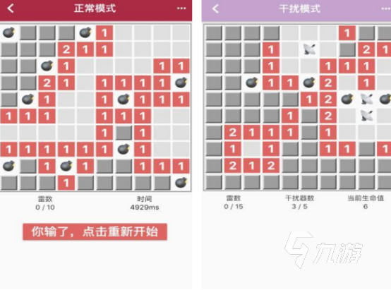 以大家熟悉的經(jīng)典玩法為主,只不過在顏色方面特別的清晰,并不是以簡(jiǎn)單的黑白畫風(fēng)為主,你可以隨意選擇自己喜歡的諸多模式,比如在干擾模式當(dāng)中,就加入了干擾器,增加了游戲的難度。需要在玩的過程當(dāng)中,了解設(shè)置的干擾器數(shù)量,正確掃雷以后,就可完成相應(yīng)的挑戰(zhàn)。其中還有定時(shí)炸彈模式以及正常的模式,都可自由選擇。