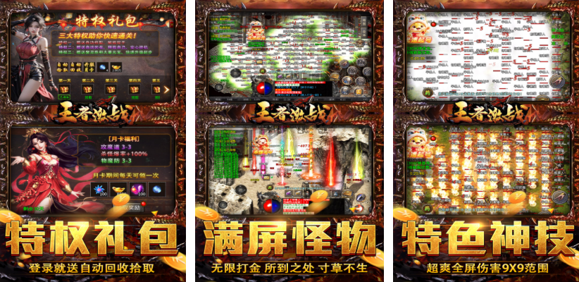 《王者激戰(zhàn)》最大的特點就是在低等級地圖也能爆出神級裝備,所以該游戲并沒有平民玩家以及氪金大佬的區(qū)別。除了傳統(tǒng)的戰(zhàn)法道三職業(yè)以外,游戲里還有特色古董玩法,玩家可以化身為古董達人,收集各種裝備以及神級技能用于充做站立。喜歡刷怪的玩家還能體驗到滿屏怪物入侵的爽感。