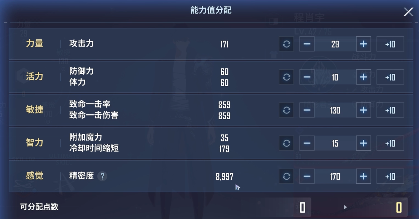 然后最好將敏捷的數(shù)值提升上去,大概+130點(diǎn)左右就夠用了。這樣就可以提升暴擊率及暴擊傷害。接著為了增強(qiáng)你的生存能力,還需要+10點(diǎn)活力。這樣就能獲得更高的防御力以及血量,讓你不至于被敵人一招秒殺。若是不小心分配錯(cuò)誤的話,也可以進(jìn)行初始化,讓你無需重頭再練。