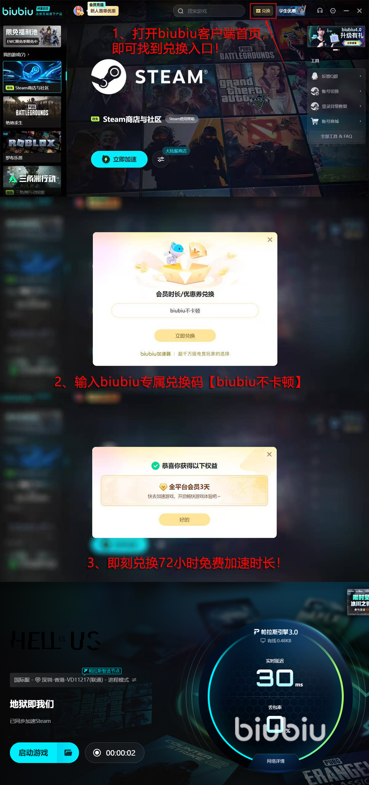 biubiu為了讓更多人體驗(yàn)到新版本所帶來(lái)的改善,還推出版本推廣活動(dòng),新用戶注冊(cè)立馬即可有福利,有二十四個(gè)小時(shí)免費(fèi)加速時(shí)長(zhǎng),可提速所有游戲,另外,大家還有機(jī)會(huì)不要?dú)怵H,使用兌換碼【biubiu不卡頓】,在首頁(yè)兌換處換到72小時(shí)的加速時(shí)長(zhǎng),也沒(méi)有任何要求,而且新人玩家參與2個(gè)活動(dòng)所獲得的福利時(shí)間是累積的,最高有96小時(shí)的哦!
