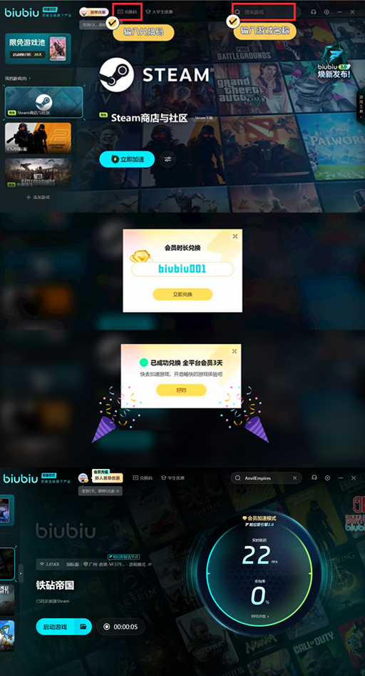 想要告別游戲延遲和卡頓?那就來試試biubiu加速器吧!現(xiàn)在只要注冊新賬號,就能輕松領(lǐng)到24小時的免費(fèi)加速時間,讓你的游戲更加流暢。而且還有更棒的福利,輸入兌換碼【biubiu001】,還能直接再拿到72小時的免費(fèi)加速!不僅新用戶可以享受,老玩家也能參與。更厲害的是,新用戶還可以將這兩個的加速時間疊加,輕松享受96小時的免費(fèi)福利,讓游戲體驗(yàn)更順暢,爽到飛起!