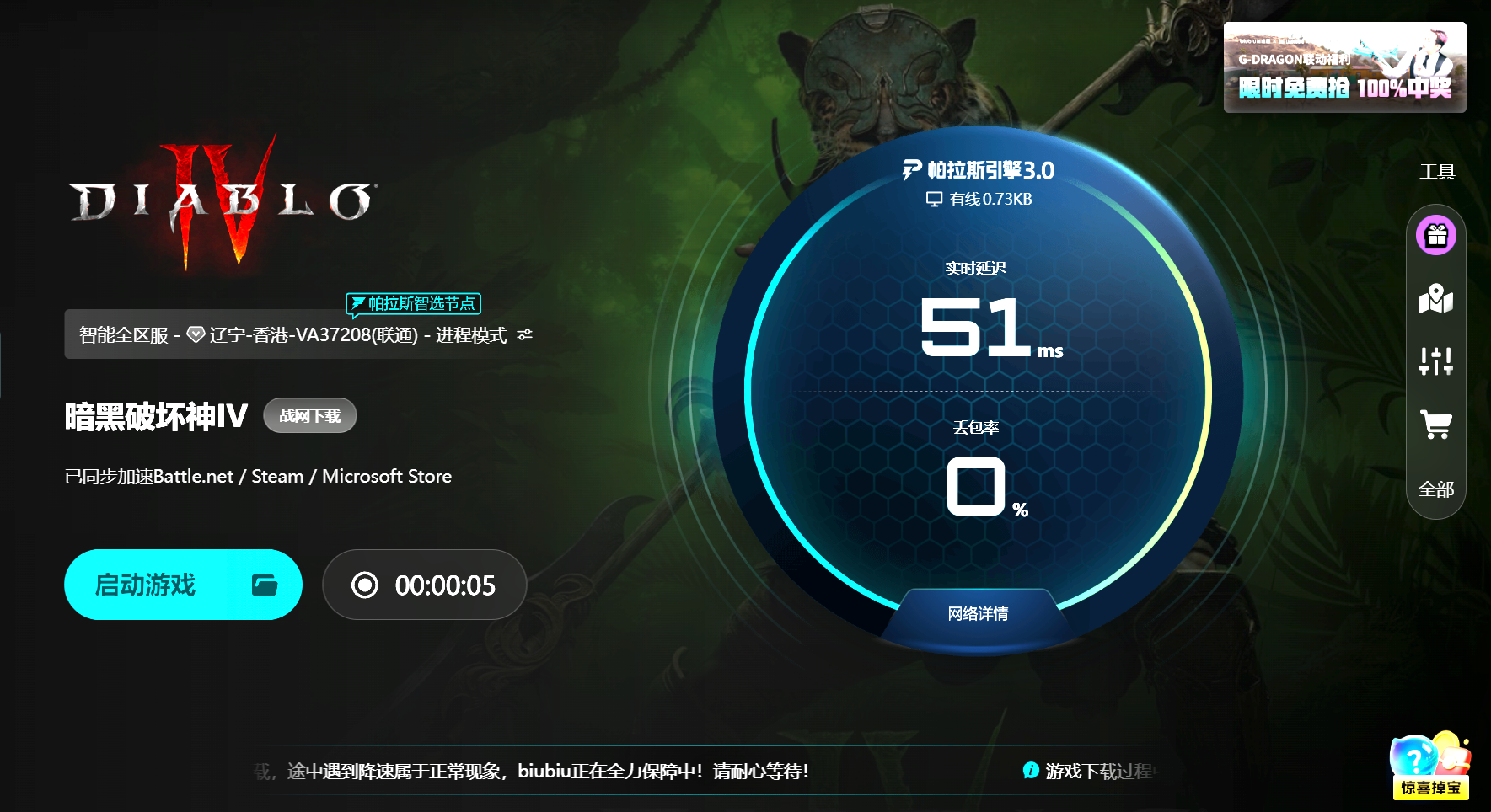 從操作體驗來看,biubiu加速器依舊保持著簡潔直觀的設計。玩家只需啟動客戶端,在搜索欄輸入“暗黑破壞神4”,選擇對應的加速模式后點擊一鍵開啟,系統(tǒng)就會自動完成網(wǎng)絡優(yōu)化,全程無需繁瑣設置。整個過程不到幾秒鐘,新手也能輕松上手,馬上投入游戲體驗。