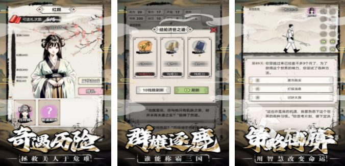 玩家擁有一個(gè)非常神奇的機(jī)器,可以穿越到古代世界,成為不同的角色,原本玩家想把三國(guó)中的每一個(gè)人物都體驗(yàn)一下,但是意外之下穿越到了一個(gè)與眾不同的三國(guó)世界,在這里不再需要帶兵打仗而是,需要體驗(yàn)經(jīng)商的玩法,玩家在游戲中的每一步選擇,都會(huì)影響著自己的命運(yùn),就是整就是整畫(huà)面設(shè)計(jì)比較簡(jiǎn)單,但是依舊非??简?yàn)玩家的策略能力。
