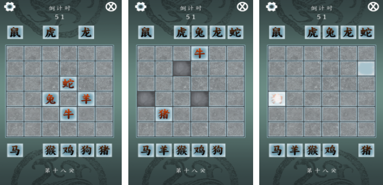 比較喜歡腦力設(shè)定的玩家,可以嘗試一下十二生肖:記憶闖關(guān),游戲開始之后,場(chǎng)景里會(huì)出現(xiàn)大量的生肖文字,每一個(gè)生肖都會(huì)在不同的位置,玩家需要做的就是快速記憶這些生肖,接著在短暫的幾秒鐘之后,這些生肖都會(huì)翻轉(zhuǎn)過去,系統(tǒng)會(huì)給出當(dāng)前關(guān)卡需要玩家尋找的生肖,想要通關(guān)玩家,玩家就要憑借記憶翻開卡牌,除了有生肖文字之外,還會(huì)有卡通生肖圖案,玩家可以來游戲里鍛煉一下自己的記憶力。