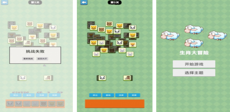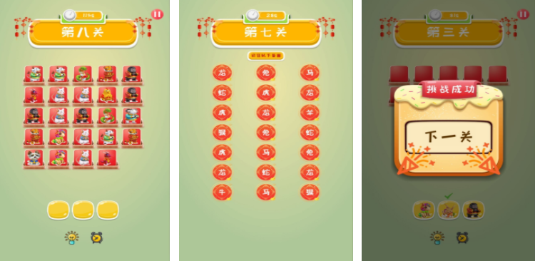 喜歡休閑游戲的玩家,可以嘗試一下生肖大冒險(xiǎn),進(jìn)入到游戲之后,會(huì)有很多生肖都出現(xiàn)在卡片上,玩家需要做的就是通過點(diǎn)擊的方式,讓這些生肖卡片被消除,每一次都需要連續(xù)點(diǎn)擊三個(gè)相同的生肖,和傳統(tǒng)平面消除不同的是,里面會(huì)設(shè)定多層的立體消除,玩家需要在游戲里不斷點(diǎn)擊,爭(zhēng)取把所有的生肖都順利消除。