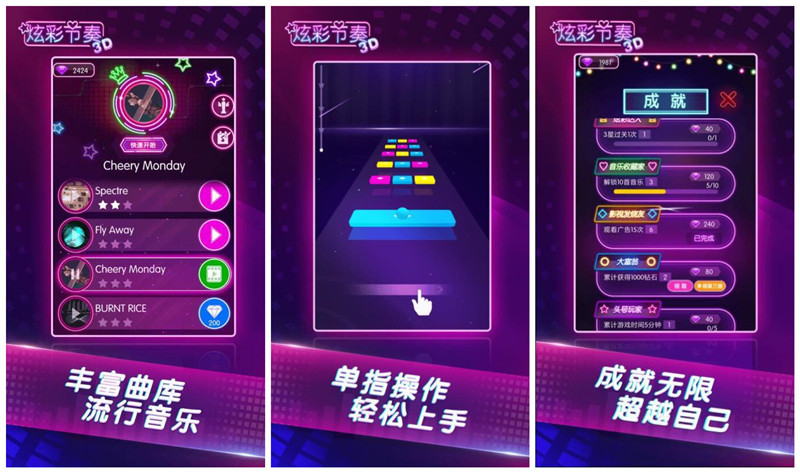 這是一款上手非常簡單的音樂節(jié)奏類游戲,玩家只需要根據(jù)提示及時(shí)點(diǎn)擊屏幕并完成光點(diǎn)的移動(dòng)軌跡就可以完成歌曲挑戰(zhàn)。游戲中包含了非常多的熱門歌曲,相信你喜愛的歌手一定在里面,快來試試吧!