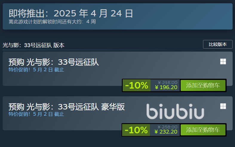 《光與影33號(hào)遠(yuǎn)征隊(duì)》已經(jīng)定于2025年4月24日正式發(fā)售,目前已開(kāi)啟預(yù)購(gòu),Steam國(guó)區(qū)標(biāo)準(zhǔn)版預(yù)購(gòu)價(jià)196.2元,豪華版232.2元送原聲+美術(shù)集,登陸Xbox Series X|S、PS5和PC(steam和Epic)平臺(tái),并首發(fā)加入XGP。