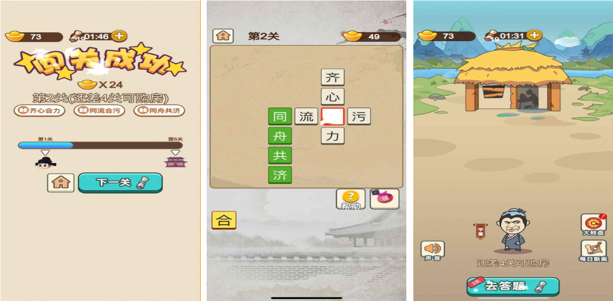 《成語接龍大闖關(guān)》如果你腦子里有貨就可以來玩這樣的游戲,最怕的是大家進(jìn)入游戲以后發(fā)現(xiàn)腦子空空,其實(shí)里面的成語有的真的非常的簡(jiǎn)單,大家可以先把自己熟悉的成語填空填起來,一個(gè)成語完成以后那個(gè)成語會(huì)變成綠色,大家可以用這種機(jī)制來試字,有自己不知道的成語就把每一個(gè)字都往空格中放一放,如果綠了就說明你放對(duì)了。