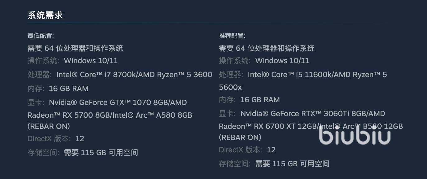 要想盡情享受這款游戲帶來的震撼體驗,對電腦配置的要求可不低。最低配置需要GTX 1070顯卡和i7-8700K/Ryzen 5 3600處理器,才能保證1080P/30 FPS的流暢運行。若想要更高的幀率與畫質(zhì),推薦配置和最佳體驗配置則分別需要RTX 3060 Ti和RTX 3080等高端顯卡。對于追求極致4K/60 FPS的玩家,更是需要配備RTX 4070 Ti SUPER或更高級別的顯卡。