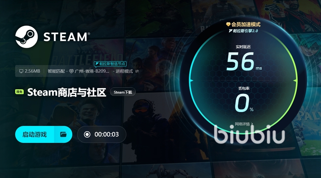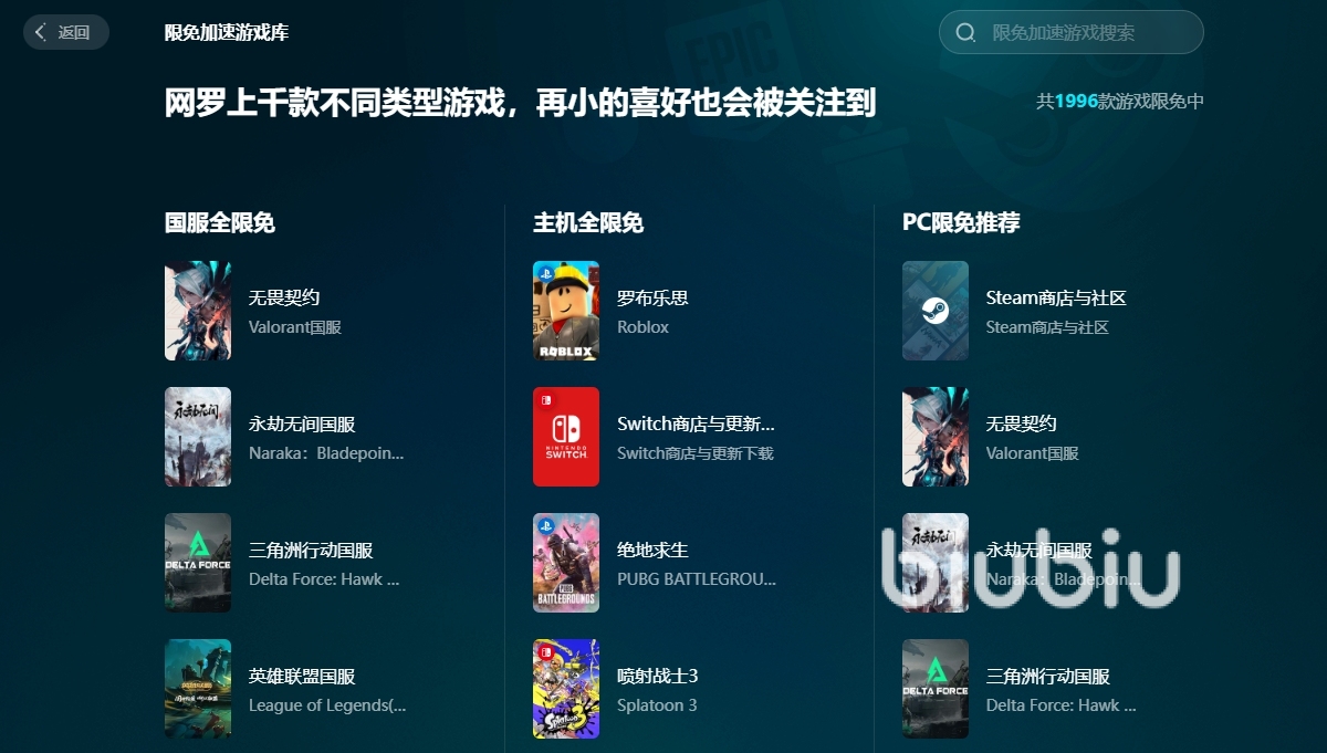 另外,biubiu也不同于其他平臺操作步驟復(fù)雜難搞,它的整體界面都是簡單明了的,我們可以直接在首頁搜索游戲名稱,即可快速找到相應(yīng)的游戲,完成加速處理。啟動之后也不需要自己手動選擇節(jié)點,平臺會根據(jù)我們當(dāng)前的網(wǎng)絡(luò)環(huán)境以及地理位置來智能匹配節(jié)點,有助于我們精準(zhǔn)的完成加速,讓玩家們無論處在什么的區(qū)域都能快速連上線路,節(jié)點覆蓋范圍很是廣泛。而且這款這個平臺內(nèi)的很多游戲還是處于限免狀態(tài)的,目前就有2000款左右游戲是可以免費體驗,限免池每隔一段時間都會進(jìn)行更新,玩家們可千萬不要錯過。