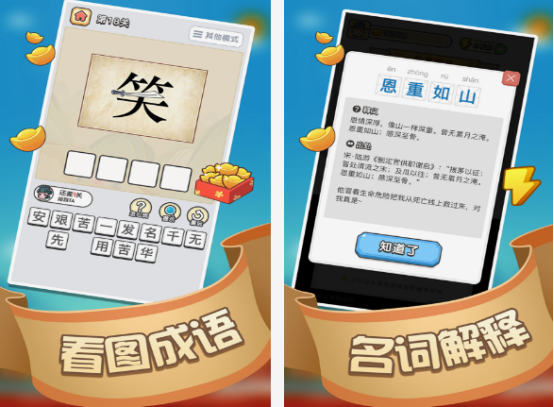 利用圖片猜出成語的玩法為主,每次體驗時看到的圖片都非常形象,要仔細的觀察,將文字以及圖片巧妙地結(jié)合在一起,更容易完成任務(wù),感受特別愉快的氛圍,讓自己開懷一笑。在學習中文,甚至是成語的時候,這款寓教于樂的,帶給大家歡樂的同時,也能學到很多的知識,應(yīng)用在生活的很多方面,提升自己的知識量。
