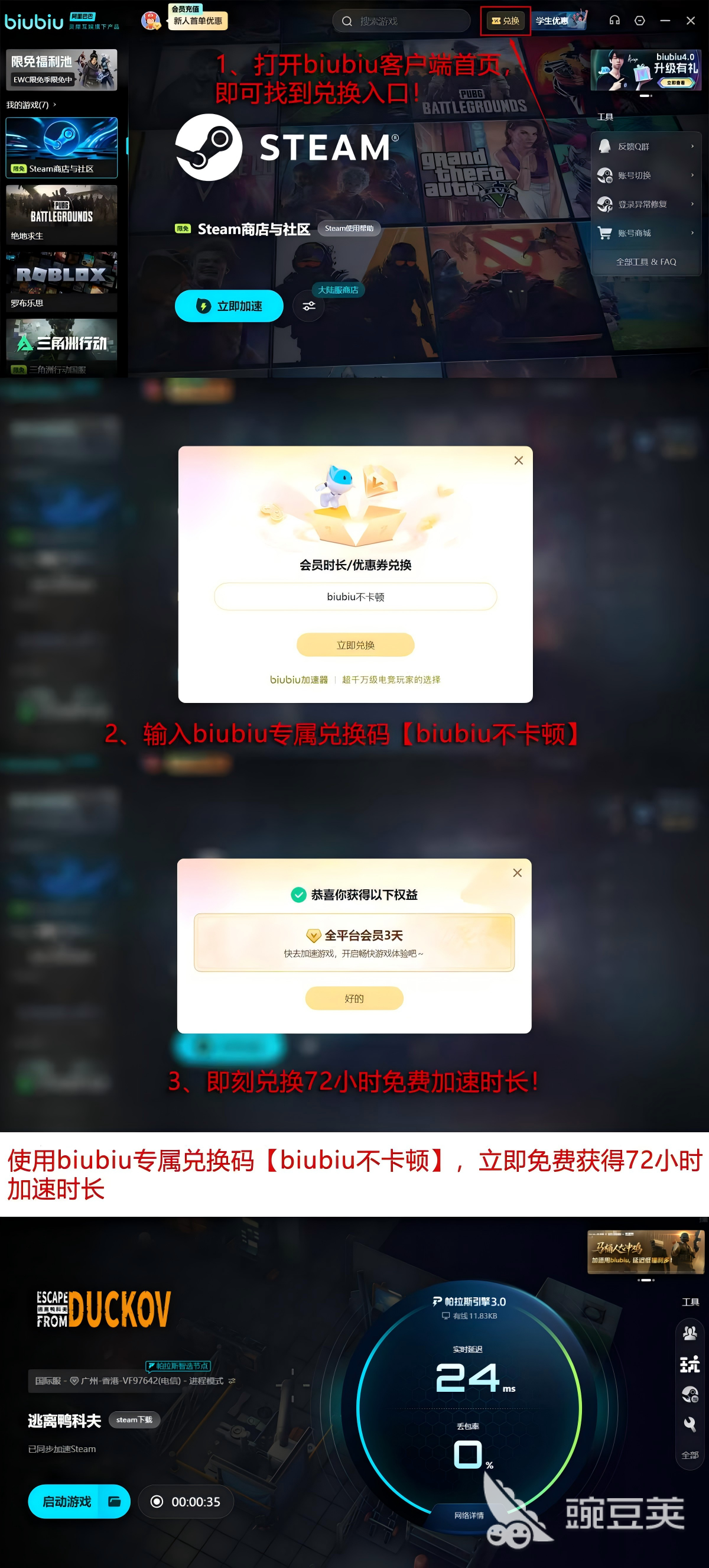 使用biubiu加速器還能享受多重福利,尤其是新用戶優(yōu)惠力度大。登錄后即可領取專屬禮包,注冊即享24小時免費加速,輸入口令【biubiu不卡頓】還可額外獲得72小時服務時長,總計可連續(xù)使用96小時,暢快體驗穩(wěn)定高速的聯(lián)機對戰(zhàn)。