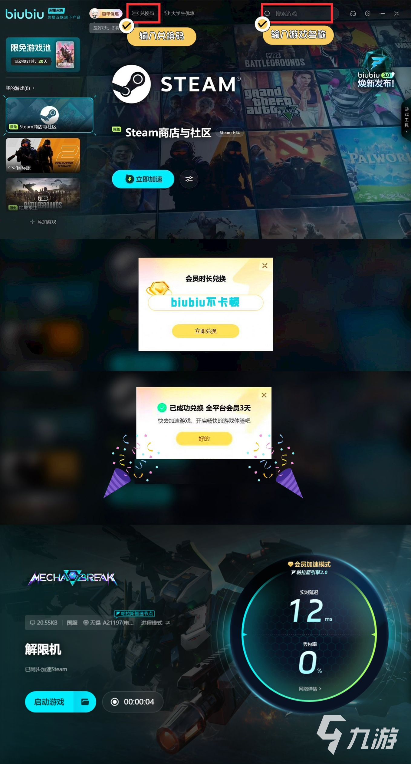 整個(gè)對(duì)戰(zhàn)的過(guò)程對(duì)于網(wǎng)絡(luò)的要求還是十分嚴(yán)格的,所以比較建議大家嘗試下上方所分享的加速工具,操作簡(jiǎn)單使用方便。同時(shí)給大家不同身份的伙伴準(zhǔn)備了很多的福利,新人的首次登錄可以拿到三個(gè)小時(shí)會(huì)員權(quán)限,而結(jié)束了之后直接跟其他伙伴一起,通過(guò)【biubiu不卡頓】這句口令兌換三天的免費(fèi)時(shí)間。