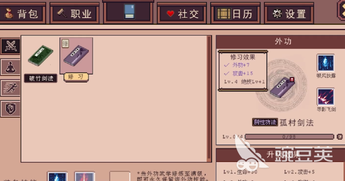 第一個是孤村劍法,孤村劍法屬于陰性功法,能夠直接提升玩家基礎(chǔ)外功屬性值七點,并且附帶有基礎(chǔ)攻擊數(shù)值十五點,當(dāng)?shù)诌_四級時,顧村劍法還會為玩家附加一層絕技效果,再釋放附屬技能尋音飛劍,以及吸風(fēng)飲露,玩家即可對敵人造成致命打擊。
