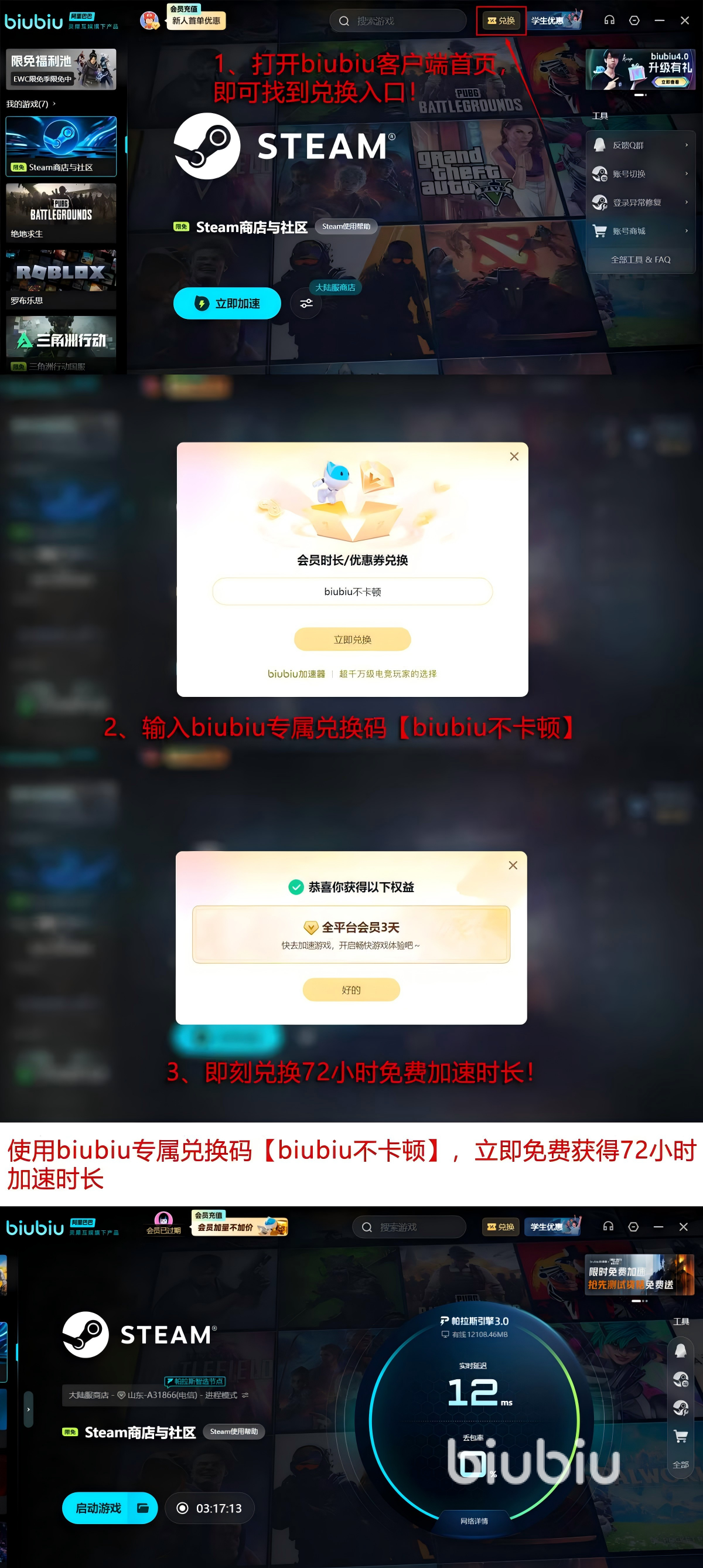 想用還能免費(fèi)加速,請快速注冊賬號,登錄后新人就會領(lǐng)取24小時(shí)免費(fèi)服務(wù)時(shí)間,【biubiu不卡頓】則是另一個(gè)神奇口令,輸入后不論新老用戶,都會得到72h額外時(shí)間,新人可放心暢享96小時(shí)加速時(shí)間的。而針對steam平臺,biubiu更是提供免費(fèi)加速功能,不限時(shí),暢心用。