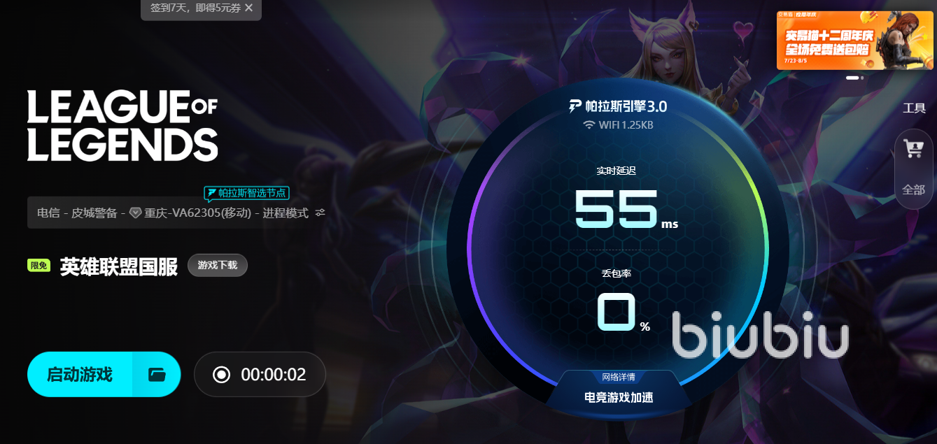在眾多加速工具中,biubiu加速器無疑是目前玩家群體中極具口碑的一款。其引入了全新的帕拉斯引擎3.0,不僅在基礎加速技術上進行了深度升級,還與職業(yè)冠軍選手 Aixleft 聯(lián)手進行實戰(zhàn)優(yōu)化,對包括《英雄聯(lián)盟》在內(nèi)的多款熱門電競游戲提供了專屬加速策略。通過智能路徑調度與節(jié)點切換,biubiu可以實時監(jiān)控玩家所連接的服務器狀態(tài),并自動匹配最優(yōu)傳輸線路,有效降低延遲、穩(wěn)定數(shù)據(jù)傳輸、減少丟包現(xiàn)象。無論你是在打排位、玩云頂,還是與朋友組隊娛樂,都能享受到更加流暢無阻的游戲環(huán)境。