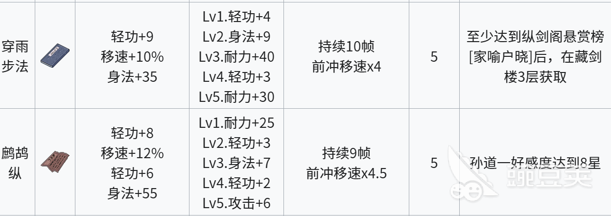 踏劍飛身這本功法在修習(xí)以后,玩家的耐力會(huì)得到顯著的提升,功法在使玩家的輕功提升5點(diǎn)、移速提升8%的同時(shí)耐力還會(huì)直接增加100點(diǎn),獲取也比較容易完成縱劍閣二層挑戰(zhàn)就行了,穿雨步法是一種能夠顯著提高玩家移動(dòng)速度的功法,該功法學(xué)習(xí)后能夠使移動(dòng)速度提高10%,輕功增加9點(diǎn),身法提升35點(diǎn),完成縱劍閣三層挑戰(zhàn)就能獲得。