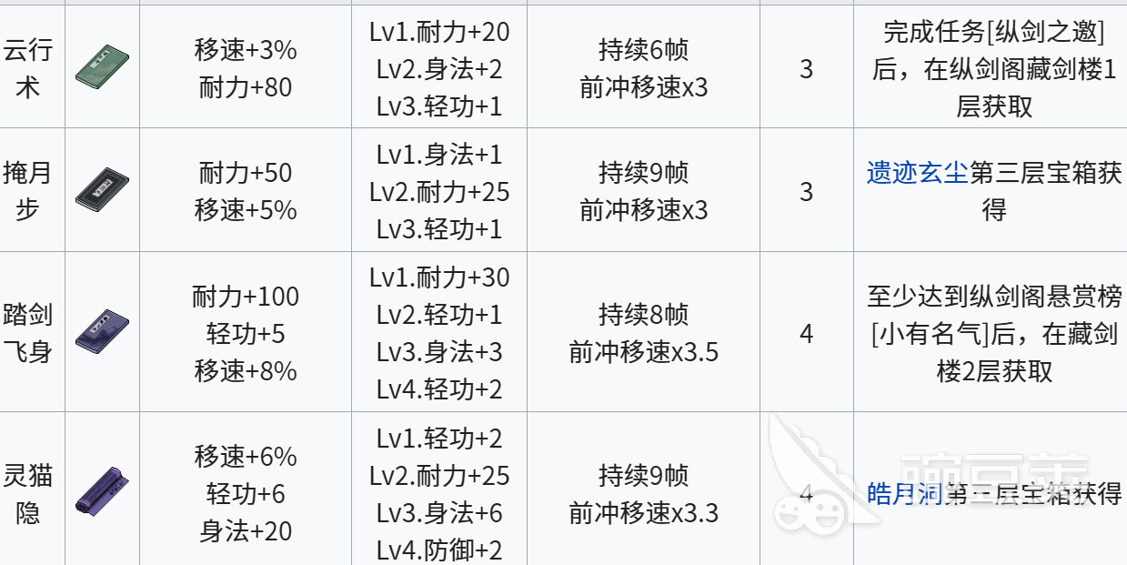 云行術(shù)在修習(xí)以后能夠使自身的移動(dòng)速度增加3%,耐力增加80點(diǎn),想要學(xué)習(xí)該輕功身法的花,玩家需要開(kāi)啟縱劍閣挑戰(zhàn),只要完成一層挑戰(zhàn)就能獲得,掩月布是一種能夠增加50點(diǎn)耐力以及5%移動(dòng)速度的功法,該功法需要玩家前往玄晨遺跡,靈貓隱這本輕功功法除了使移速增加6%以外,自身的輕功還會(huì)增加6點(diǎn),身法會(huì)增加20點(diǎn),該功法需要玩家在皓月洞獲取。