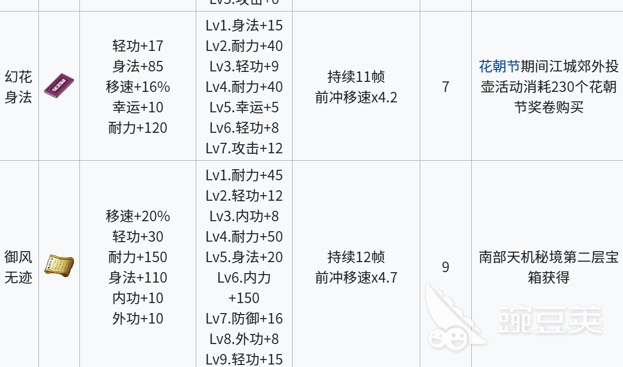 幻花身法需要玩家在花朝節(jié)中獲取,這本功法除了能夠增加輕功、身法、移速以及耐力以外,還能夠贈(zèng)10點(diǎn)的幸運(yùn)值呢,御風(fēng)無(wú)跡則需要玩家在南部天璣秘境里的第二層獲取,這本輕功功法也是游戲中目前品階最高的一本,學(xué)會(huì)這本功法,玩家的移速會(huì)增加20%,輕功增加30,耐力增加150,身法增加110,內(nèi)功和外功也都會(huì)各自增加10點(diǎn)。