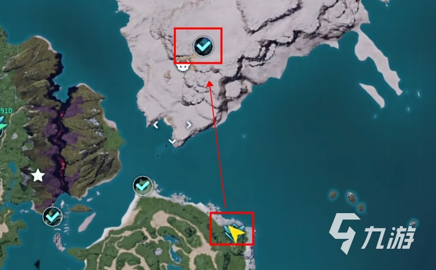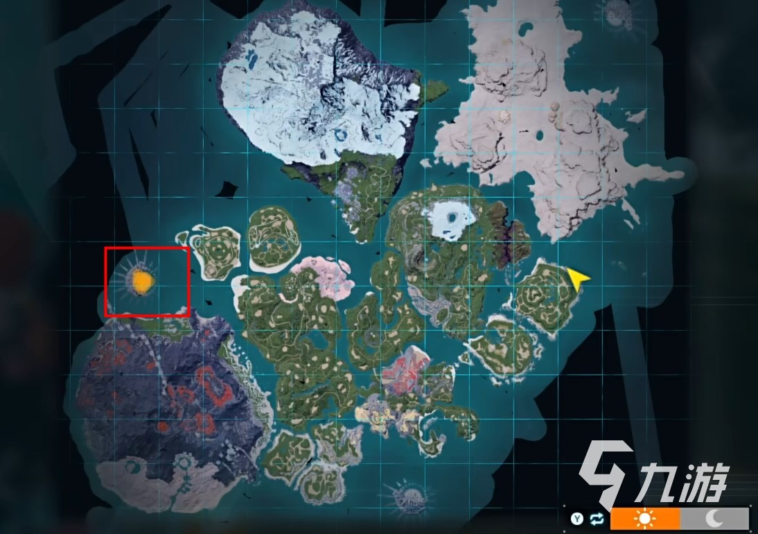 如圖所示,前期大家可以去往地圖最右端荒蕪島嶼,然后騎著可以飛行的帕魯去往對(duì)面的荒漠沙丘,BOSS就是沙丘的地下。而后期穩(wěn)定刷新點(diǎn)則是在地圖最左端的島嶼。