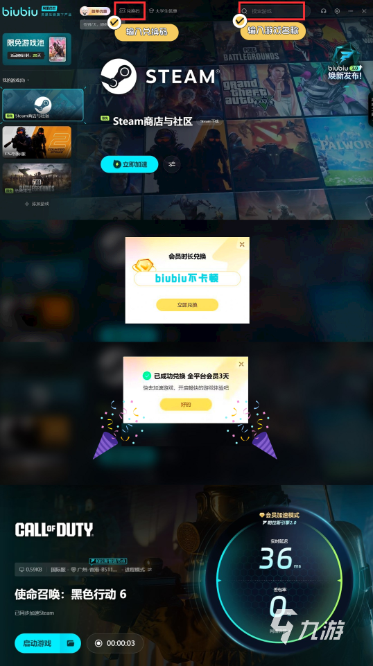 大家在游玩時(shí)還可以下載biubiu加速器來進(jìn)行加速,現(xiàn)在有個(gè)好福利,那就是8月28號(hào)到9月9號(hào)可以限時(shí)免費(fèi)加速使命召喚黑色行動(dòng)6,除此之外新用戶注冊(cè)能得24小時(shí)的免費(fèi)體驗(yàn)時(shí)長(zhǎng)、輸入兌換碼【biubiu不卡頓】還能得到3天加速時(shí)長(zhǎng)。