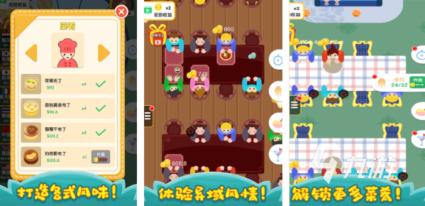 這里有中外經(jīng)典的食物,只需要手指輕點就能制作出色香味俱全的美食,俯視的角度能讓你完美觀察廚房、餐廳大堂的情況,餐廳的風(fēng)格也可以改變成你喜歡的樣子,每天還會有限時的雙倍收益時間,抓緊賺錢,你就能升級餐品的種類,種類越豐富你能招待的客人也就越多,創(chuàng)造一個餐飲帝國指日可待了。