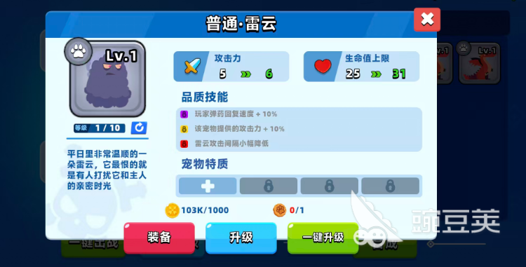 雷云:外觀看起來是一朵黑灰色的云,基礎(chǔ)的攻擊不算高,但是技能效果可以讓玩家的彈藥回復(fù)速度提升10%的速度,所以要是想要走速攻的話其實也可以考慮這個寵物,還有一個增益是可以讓寵物本身的攻擊力+10%,且在品質(zhì)上升之后雷云的攻擊間隔還會有一定幅度的降低,所以搭配雷系的話也可以讓整體流派的輸出速度加快很多。