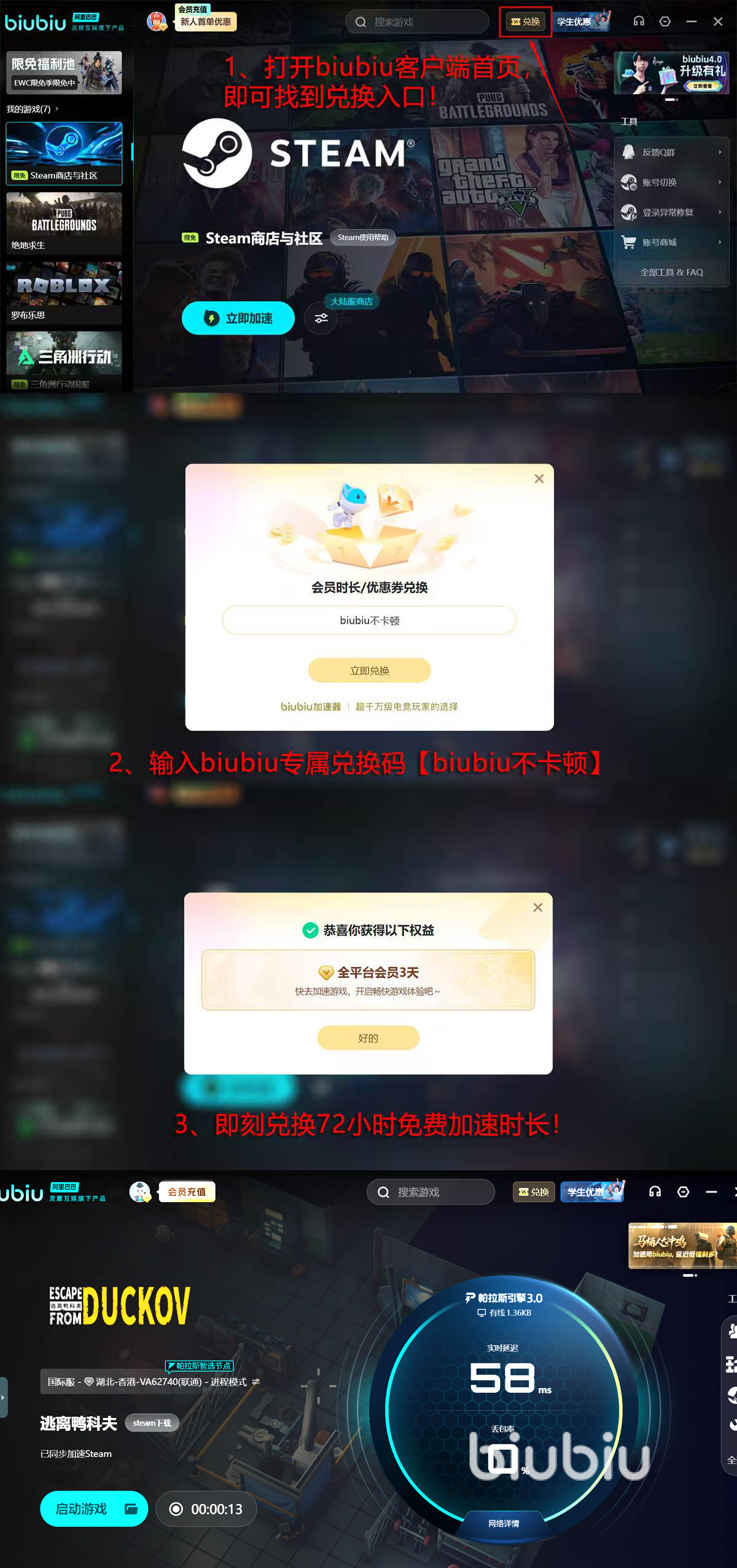 最后,為了讓大家有更好的操控性,biubiu邀請電競選手左梓軒作為產(chǎn)品體驗官,為優(yōu)化提供專業(yè)指導。大家可參與【biubiu不卡頓】口令兌換活動,在首頁獲得72小時免費體驗時長,新人注冊后還能再多24小時,因此新人的時間是96小時。