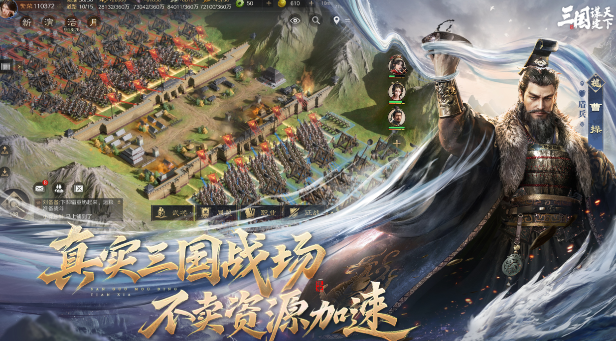 三國:謀定天下這款軍事類游戲呈現(xiàn)出了很真實(shí)的背景,源源不斷的資源呈現(xiàn)會(huì)讓玩家的軍隊(duì)實(shí)力大增,游戲完全是策略至上對(duì)每個(gè)玩家都很公平,攻占城池、開發(fā)武將等超多趣味性玩法應(yīng)有盡有,多樣化的職業(yè)與兵種搭配讓游戲的趣味性增強(qiáng),寫實(shí)的沙盤地圖帶來的三國戰(zhàn)場背景更顯的生動(dòng),快節(jié)奏的軍事戰(zhàn)爭玩法吸引了更多軍事愛好者。