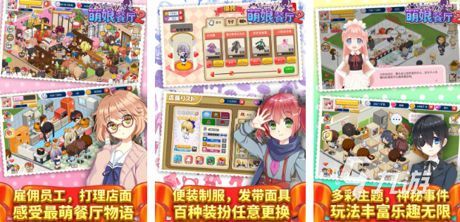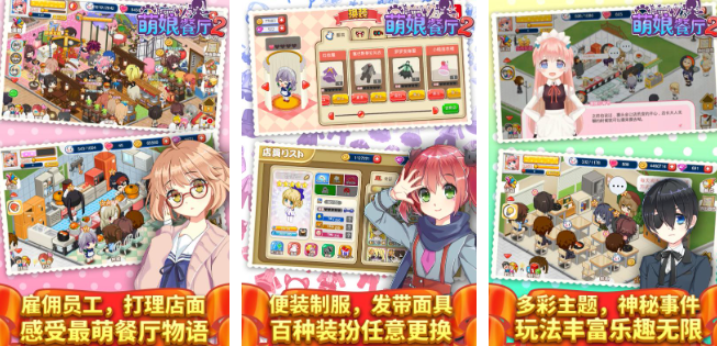 餐廳萌物語把二次元風格和餐廳經(jīng)營結合到了一起,主要就是養(yǎng)店員和打造主題餐廳,店員能換衣服還能參加特訓,換不同的衣服會影響他們的服務速度和出錯概率,特訓之后還能學會特別的待客動作和特效,裝修餐廳的時候可以自己拼搭模塊,想弄成和風包廂就配榻榻米和浮世繪,想弄女仆主題就多放蕾絲和貓耳元素。