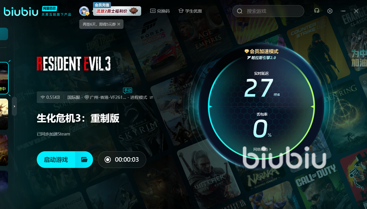 生化危機3重制版目前來說暫時沒有國服上線,為了進入這一片異域之都。我們就要開啟biubiu,才能夠被直升飛機送到這里來解決喪尸。新用戶的話,可領取三個小時的免費加速。此外新老玩家輸入【biubiu不卡頓】,就能額外領取三天免費加速。如果在剛開始時就卡頓,可能連喪尸群都突破不出去。采用加速器后,才可以一鼓作氣地闖過前面的難關,而不是被這些僵尸圍堵在后面。