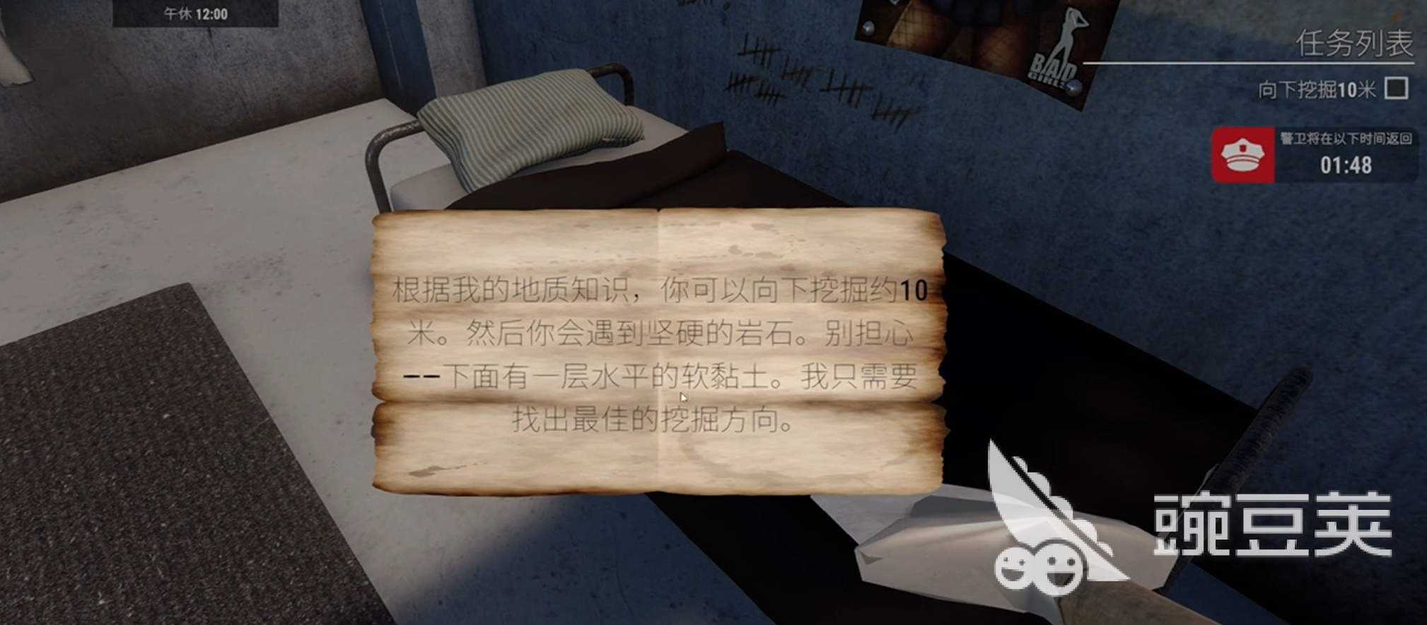 挖隧道是一個(gè)非常龐大的工程,玩家每次挖掘都會(huì)消耗大量的體力值。當(dāng)體力值見底以后你就不能再挖掘了,所以想要盡快的挖掘出一條隧道,那么你最好找到一個(gè)趁手的工具。每天中午吃飯的時(shí)候,玩家可以多拿一雙筷子和一個(gè)勺子。再回到監(jiān)牢以后,玩家只需要掀開這里的地毯就可以挖掘隧道了。挖掘隧道會(huì)發(fā)出巨大的聲響,所以小伙伴們每次挖掘一段時(shí)間,都要將頭伸到監(jiān)牢外面探望,一旦玩家在挖掘隧道的時(shí)候被警察發(fā)現(xiàn),那么這局游戲就會(huì)直接結(jié)束了。