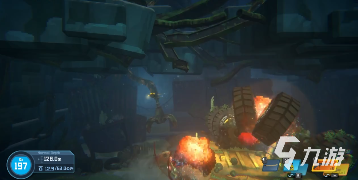 3、再有就是大家在攻擊B0SS的時候可以使用炸藥桶,不過需要注意的一點是,為了在拿不炸藥桶的時候不被攻擊,最好在規(guī)避一次攻擊之后再去扔。再有就是如果大家覺得當前的位置不好太靠左邊,那么可以從最上邊游過去,此時B0SS就會自己后退。