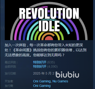 新游推出還是很能調(diào)動(dòng)玩家的積極性的,steam就是比較全面的平臺(tái),每年都會(huì)上線不少新作,讓大家可以根據(jù)愛好去選擇。這是在線類型的網(wǎng)頁(yè)掛機(jī)游戲,玩起來(lái)還是很簡(jiǎn)單的。RevolutionIdle上線日期什么時(shí)候大家來(lái)看看吧,要是現(xiàn)在就能玩,直接就可以獲得然后開啟游戲了。