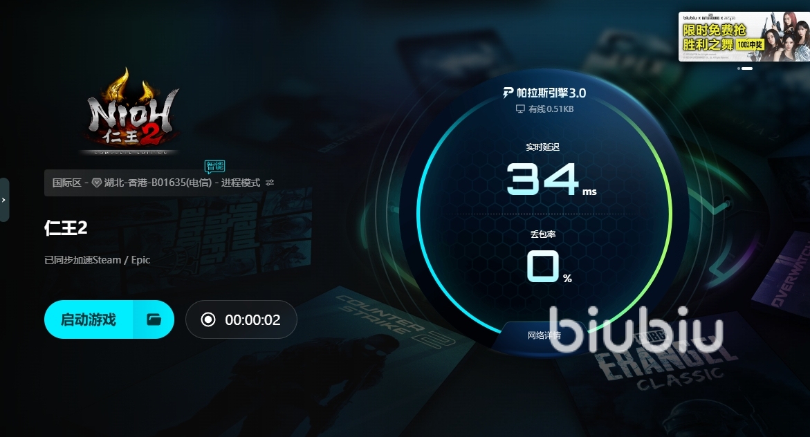 總之,引起仁王PC一打開(kāi)就閃退的原因多種多樣,但是,無(wú)論仁王pc一打開(kāi)就閃退怎么解決,網(wǎng)絡(luò)是首要必須解決的問(wèn)題之一,因?yàn)闊o(wú)論解決與否,在打游戲的過(guò)程中都需要一個(gè)穩(wěn)定的網(wǎng)絡(luò)環(huán)境,而biubiu加速器不僅可以解決網(wǎng)絡(luò)問(wèn)題,還能為游戲建立穩(wěn)定環(huán)境,同時(shí)預(yù)防網(wǎng)絡(luò)問(wèn)題。