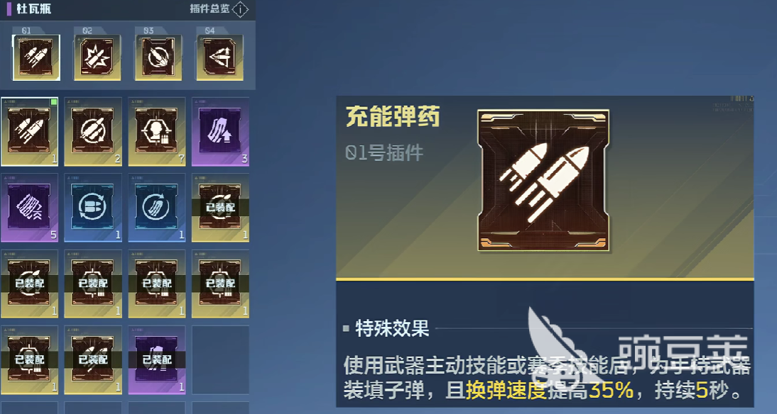 杜瓦瓶的插件選用方面,一號位置建議使用充能彈藥,充能彈藥的特殊效果是,可以為手持武器自動填充子彈,同時換彈速度可以提升35%,持續(xù)時間為五秒。